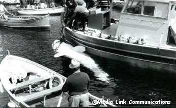 Arrivant sur zone vers 7 h, il vérifie les flotteurs intermédiaires ; l’un d’eux demeure invisible, laissant présager une capture de taille. A l’aide d’un grappin il tente vainement de remonter la ligne-mère. Le pêcheur appelle à la rescousse le patron d’un bateau de pêche au gros, dont le vire-ligne vient progressivement à bout de la prise, énorme et blanche. En
