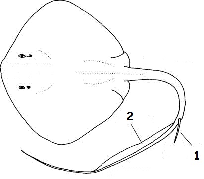 – Longue queue (généralement supérieur à la largeur du disque), mince et en forme de fouet, sans aileron dorsal ou caudal