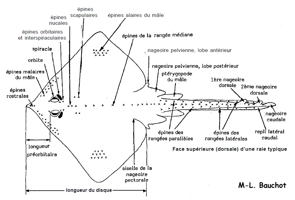 La plupart possèdent des épines sur la face dorsale du corps, mais elles ne sont pas armées, c’est à dire qu’elles ne portent pas d’aiguillons. On notera également qu’elle ne posséde pas davantage d’organe électrique, ni de nageoire anale.