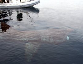 Le requin pèlerin passe de nombreuses heures en la surface. On distingue alors souvent hors de l’eau sa nageoire dorsale, sa caudale et aussi le bout de son museau.