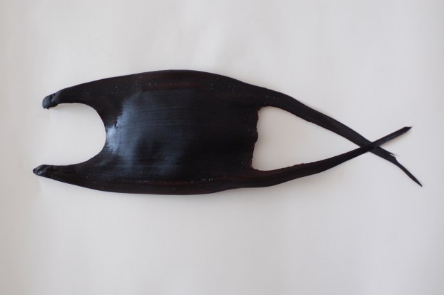Remarque : cette capsule est surement venue s’échouer après la tempête de secteur sud-est du 6 novembre 2011. L’examen n’a révélé aucune trace de prédation ; l’ouverture de l’aileron supérieur prouve que la jeune raie est parvenue à terme.